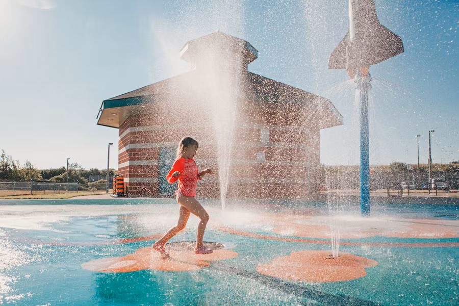 A tucked-away splash zone with winding trails and open green space—great for a relaxed, shady water play day. Open 8am–8pm, daily June–September.